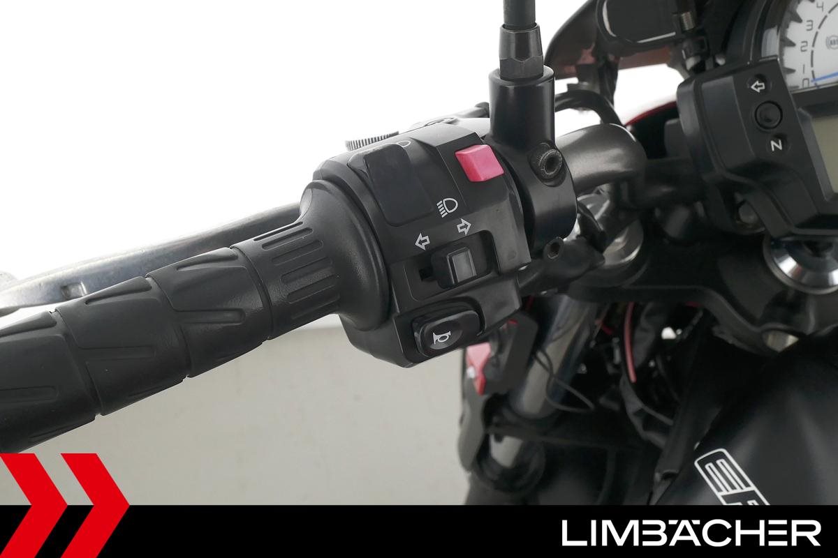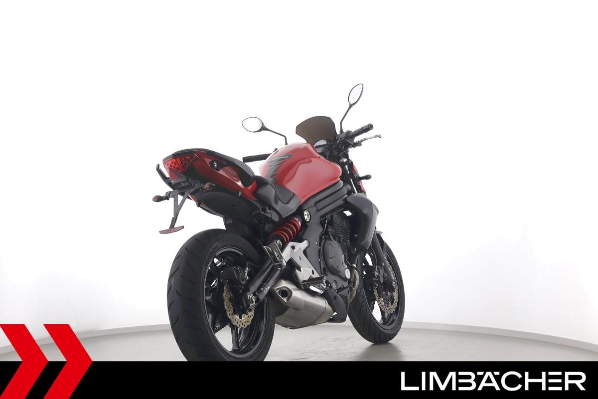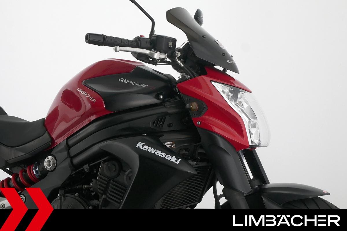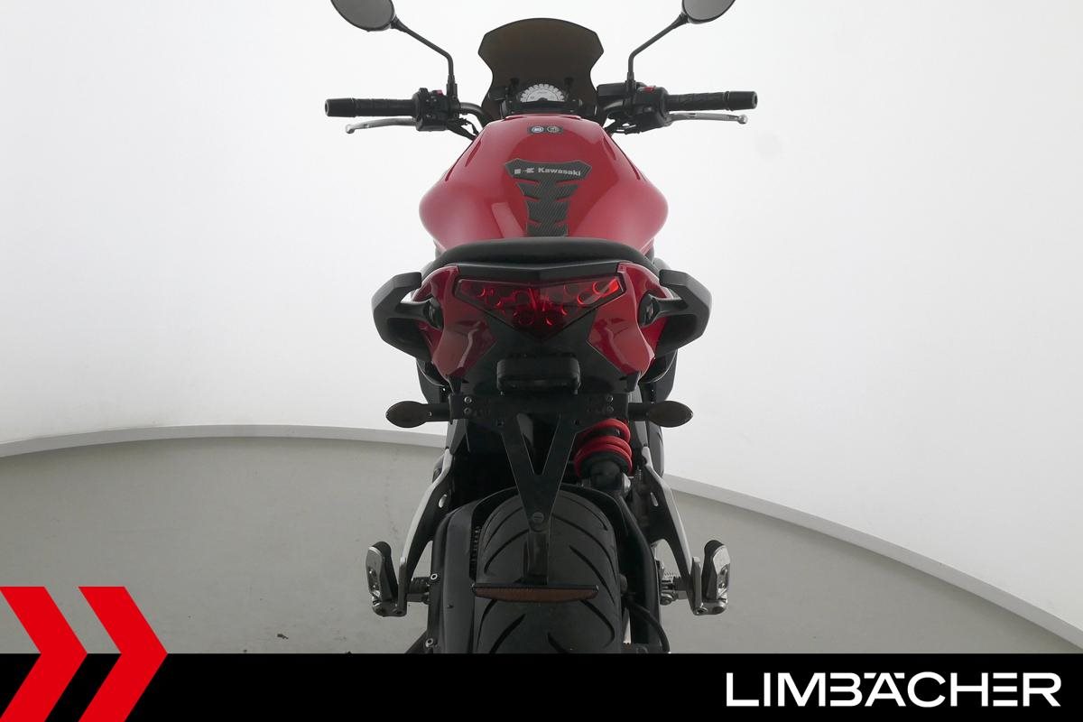 Eine scheckheftgepflegte Kawasaki ER-6n in gepflegtem Zustand u.a. mit kurzem Kennzeichenhalter sowie Ganganzeige.